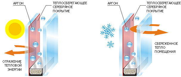 Стекло со специальным покрытием, селективно отражающим инфракрасные лучи (длинноволновую область спектра излучения), которые переносят тепло. Поскольку покрытие состоит из очень тонких слоев, напыляемых на поверхность стекла, то энергосберегающее стекло свою прозрачность к видимому свету изменяет незначительно. Энергосберегающее стекло отражает инфракрасное (тепловое) излучение обратно в помещение.